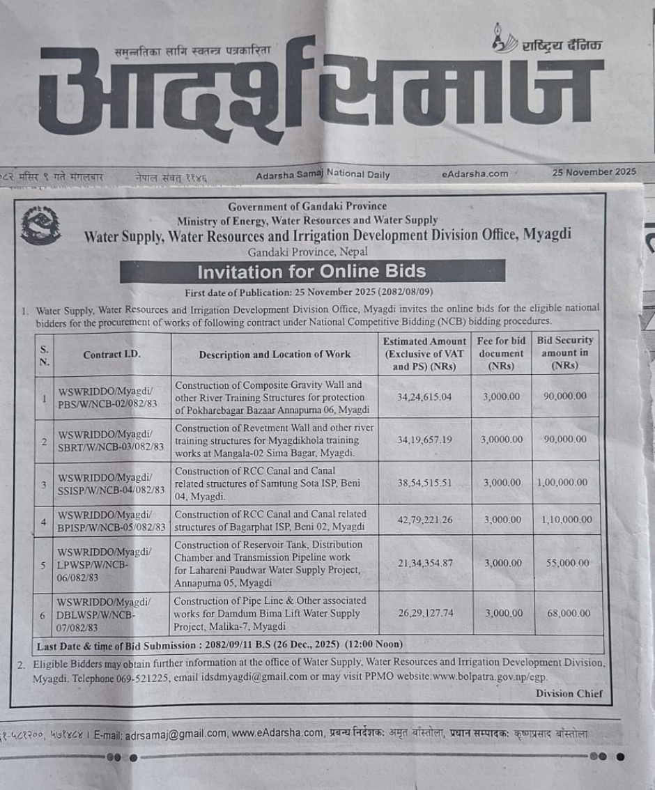 तस्बिर : आ.व. 2082/083 को विभिन्न खानेपानी, सिंचाई तथा नदी नियन्त्रण योजनाहरुको बोलपत्र आब्हान सम्बन्धी सूचना